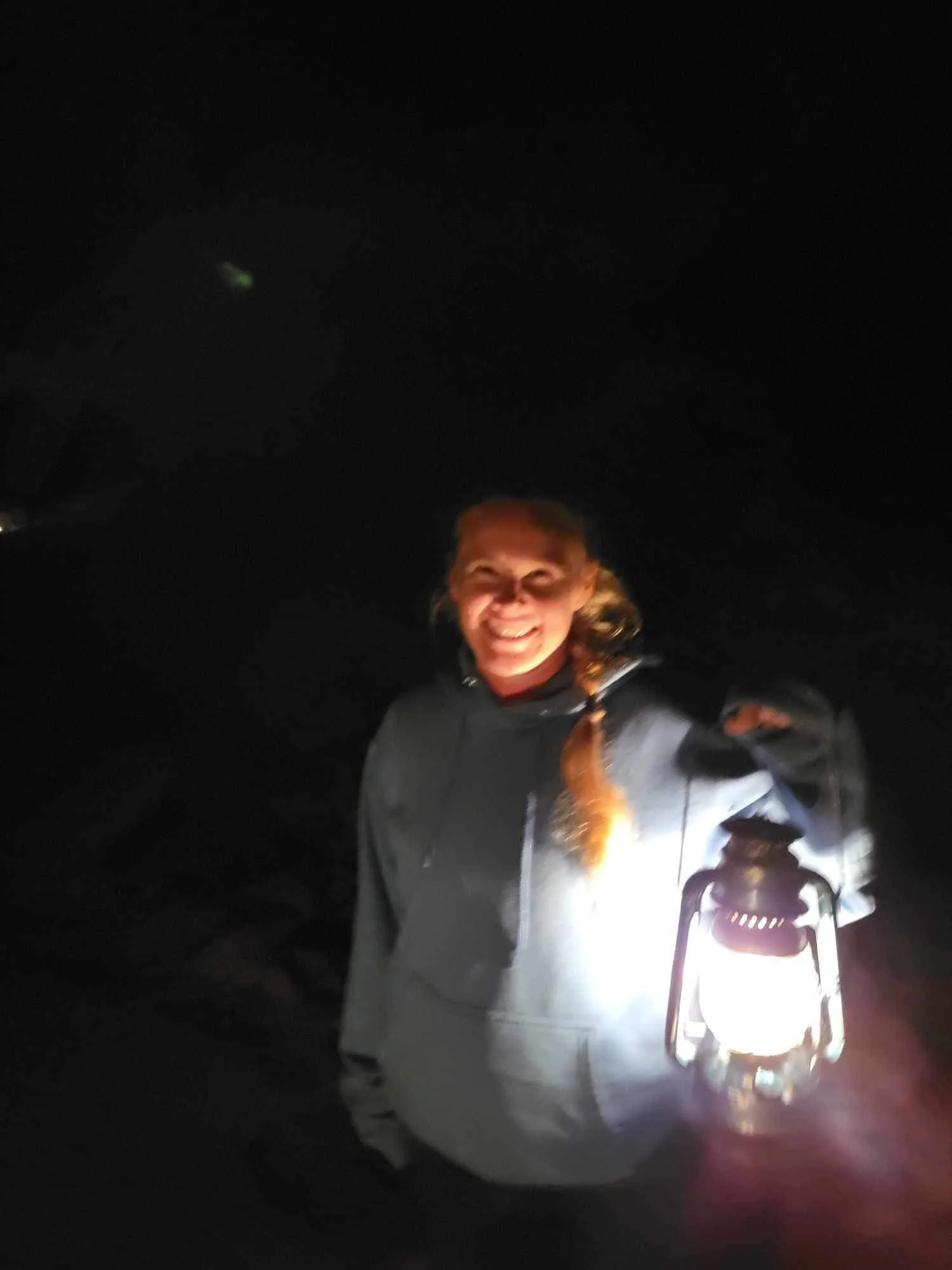 Yours Truly holding oil lantern incorrectly so that her face is illuminated. Correct position of lantern holding is arms down so as to illuminate the path in front of you.